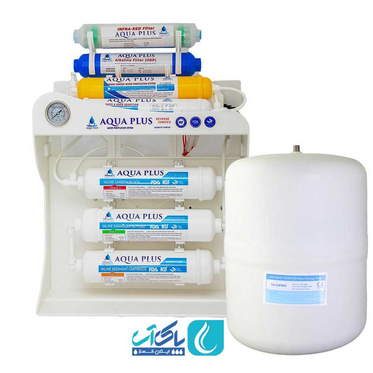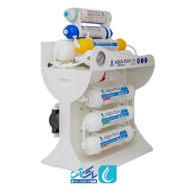 دستگاه تصفیه آب ده مرحله ای خانگی آکوا پلاس (PI 8000) AQUA PLUS RO8 8Stage باسیستم اسمز معکوس RO (ساخت کشور تایوان) در طی 8 مرحله توسط 8 فیلتر آب را تصفیه میکند.
