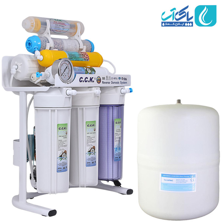 دستگاه تصفیه آب شش مرحله ای خانگی cck با سیستم اسمز معکوس RO (ساخت کشور تایوان) در طی شش مرحله توسط 6 فیلتر آب را تصفیه میکند. همچنین مخزن دستگاه با برند تانک پک می باشد
