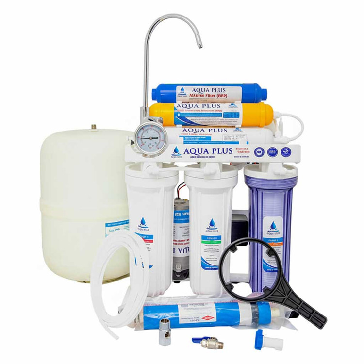 دستگاه تصفیه آب هفت مرحله ای خانگی آکوا پلاس با سیستم اسمز معکوس RO (ساخت کشور تایوان) در طی 7 مرحله توسط 7 فیلتر آب را تصفیه میکند. همچنین مخزن دستگاه با برند تانک پک می باشد